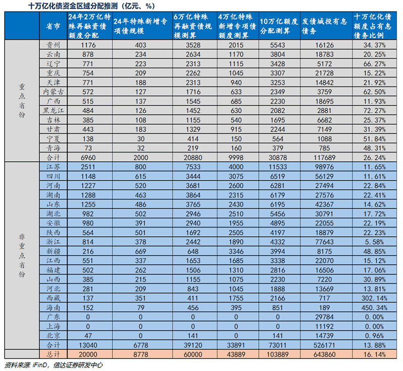 2024年對(duì)城投而言是化債大年?;瘋尘跋?,各省市近期隱債化債情況如何?隨著10萬億化債資金落地,后續(xù)各省區(qū)域分配情況又會(huì)怎樣? 2024年是化債政策頻出的一年。上半年重要會(huì)議對(duì)化債表態(tài)積極,金融機(jī)構(gòu)支持平臺(tái)債務(wù)風(fēng)險(xiǎn)化解、SPV、統(tǒng)借統(tǒng)還等政策逐步落地,且化債方案期限延長至27年6月份,支持區(qū)域也由重點(diǎn)省份向非重點(diǎn)省份全面展開。各省合發(fā)8000多億特殊新增專項(xiàng)債用于償還存量債務(wù),而且4000億特殊再融資債緩解地方隱債和拖欠企業(yè)款項(xiàng)償付的壓力。9月之后相關(guān)化債增量政策出臺(tái),特別是11月10萬億化債資源落地,額度分配或向隱債存量規(guī)模較大的省份傾斜。僅1個(gè)月時(shí)間,2024年新增2萬億置換債額度已發(fā)行完畢。隨著化債資源落地,及各地政府工作報(bào)告、預(yù)算調(diào)整、執(zhí)行報(bào)告的不斷披露。近期各地隱債化解情況如何? 據(jù)企業(yè)預(yù)警通數(shù)據(jù),近一周以來,全國超80個(gè)地區(qū)在相關(guān)報(bào)告或會(huì)議中提及政府債務(wù)化解信息,其中近半數(shù)與置換存量隱債額度相關(guān)。80個(gè)地區(qū)中不乏一些知名一二線城市,如:南京獲302.91億元專項(xiàng)債務(wù)限額用于置換存量隱債;杭州市獲126.13億元,分配市本級(jí)16.6億元。除此之外,多地超額完成2024年隱債化解任務(wù)。舉例:2024年內(nèi)蒙古達(dá)拉特旗303%超額完成化解政府債務(wù)任務(wù),實(shí)現(xiàn)階段性清零;內(nèi)蒙古土默特右旗超額完成年度隱債化解任務(wù),成功實(shí)現(xiàn)退橙目標(biāo);德陽市羅江區(qū)2024年完成化解任務(wù)207%,提前完成1家平臺(tái)公司隱債清零。 10萬億化債資金 各省區(qū)域分配情況如何? 盡管2023年部分區(qū)域或?qū)﹄[債進(jìn)行補(bǔ)錄,但未補(bǔ)錄入隱債系統(tǒng)的平臺(tái)經(jīng)營性債務(wù)或不在支持范圍。市場(chǎng)認(rèn)為10萬億化債資源置換隱債主要針對(duì)2023年底已確認(rèn)的14.3萬億隱債。 2024年2萬億置換債額度發(fā)行完畢,其中六地規(guī)模超千億,分別為江蘇、湖南、河南、貴州、四川和山東。其中江蘇省發(fā)行規(guī)模最大,達(dá)到2511億元。由此可見,本次額度可能更多向城投債務(wù)體量較大、存量隱債較多的區(qū)域傾斜。