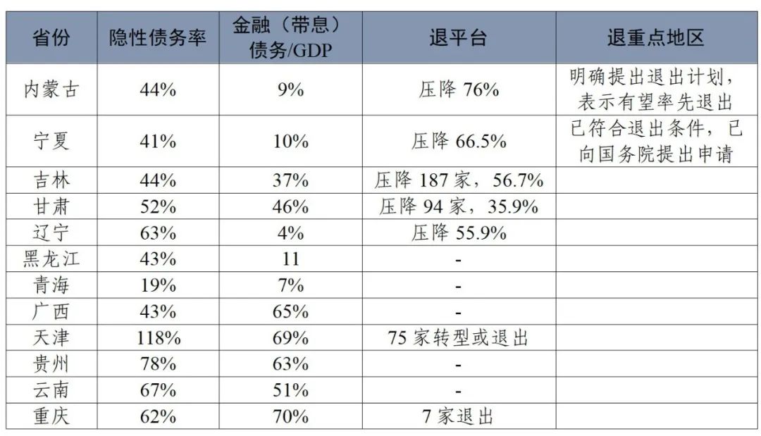 綜合來看,退出重點省份的順序或為:第一批寧夏、內蒙古、吉林、遼寧、青海、甘肅、黑龍江;第二批重慶、天津;第三批廣西、云南、貴州。結合隱債化解完成的時間來看,各地有望在2028年之前陸續(xù)完成重點省份序列的退出。