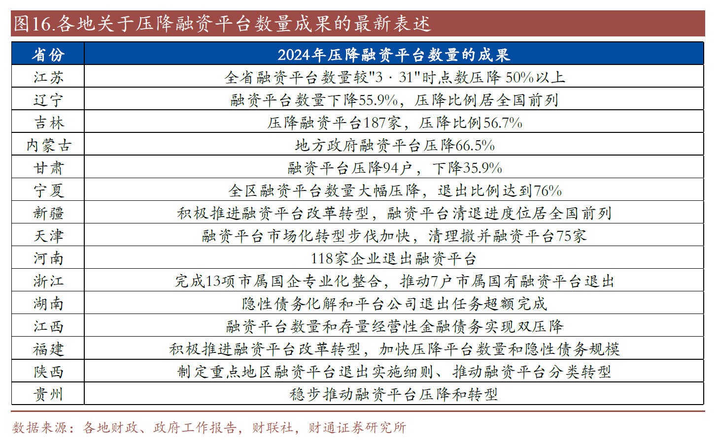 2025年,多地依然把壓降融資平臺(tái)數(shù)量、推動(dòng)融資平臺(tái)退出與轉(zhuǎn)型作為化債工作的重點(diǎn)。150號(hào)文明確提到退平臺(tái)時(shí)間不晚于2027年6月末,各省根據(jù)化債情況,地方政府可能會(huì)提前退平臺(tái)的時(shí)間要求,我們預(yù)計(jì)2025年將會(huì)是各地城投融資平臺(tái)“退名單”的大年。