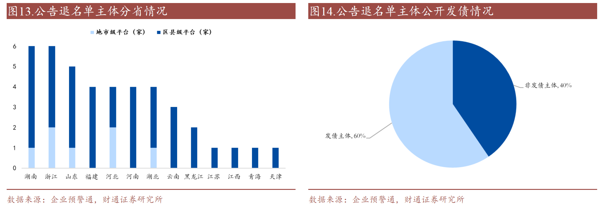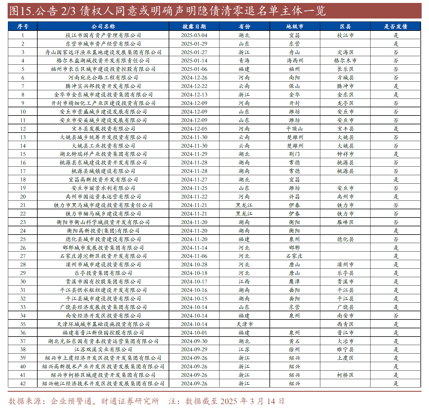 截至目前,公開就擬退出融資平臺(tái)名單征求2/3金融債權(quán)人同意或明確聲明隱債清零退出名單的主體共42家,以區(qū)縣級(jí)平臺(tái)為主,主要分布在湖南、浙江、山東等省份,其中發(fā)債主體占比60%,非發(fā)債主體占比40%。