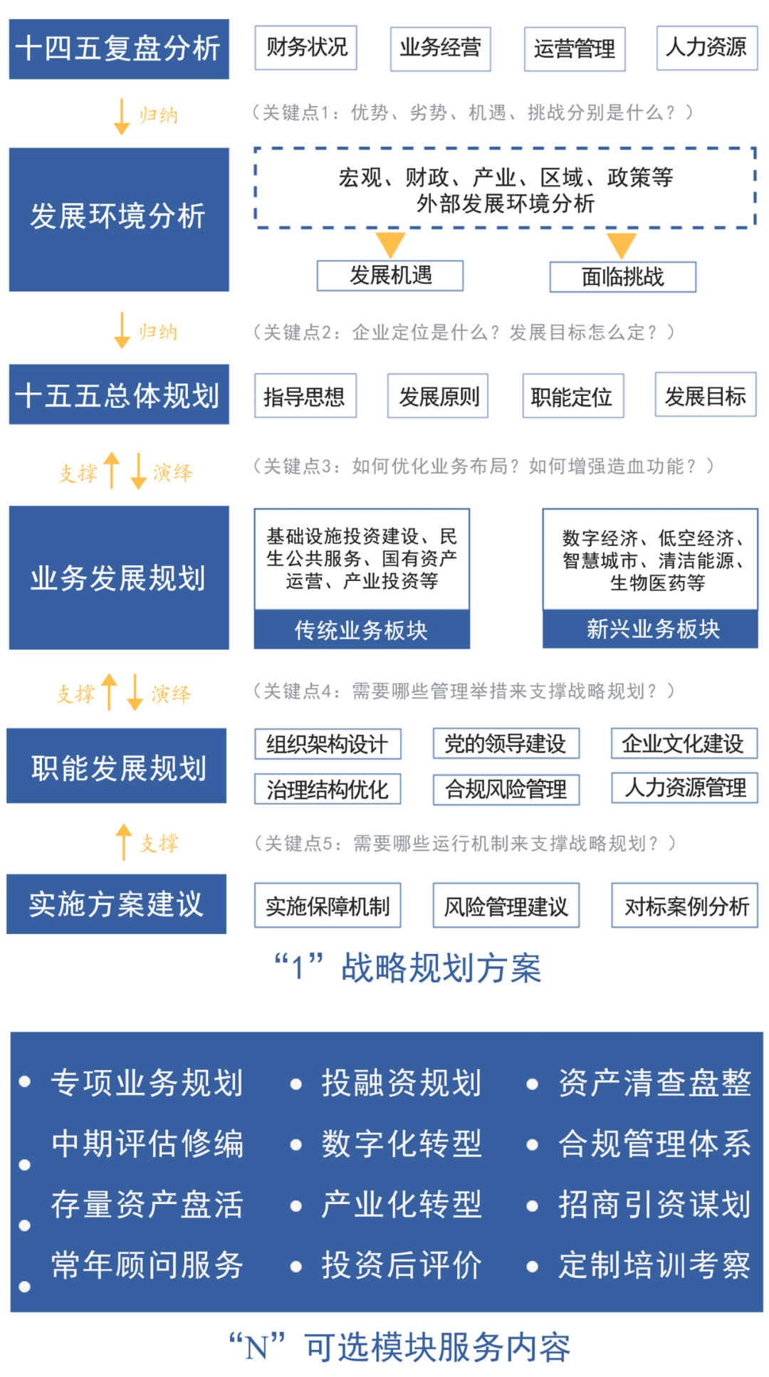 關(guān)鍵2:企業(yè)定位是什么?發(fā)展目標(biāo)怎么定?關(guān)鍵3:如何優(yōu)化業(yè)務(wù)布局?如何增強(qiáng)造血功能?關(guān)鍵4:需要哪些管理舉措來支撐戰(zhàn)略規(guī)劃?關(guān)鍵5:需要哪些運(yùn)行機(jī)制來支撐戰(zhàn)略規(guī)劃?面向“十五五”,城望以“變局識(shí)勢(shì)、謀局定向、破局攻堅(jiān)”構(gòu)建高質(zhì)量發(fā)展戰(zhàn)略體系,賦能國資國企提質(zhì)效、抓創(chuàng)新、促改革、調(diào)結(jié)構(gòu),為國資國企在“十五五”期間高質(zhì)量發(fā)展夯實(shí)基礎(chǔ)。為提供更精準(zhǔn)高效的服務(wù),城望集團(tuán)在編制“十五五”規(guī)劃定向服務(wù)的基礎(chǔ)上升級(jí)構(gòu)建“1+N”服務(wù)體系,圍繞“十五五”規(guī)劃中重點(diǎn)業(yè)務(wù)中期修編、數(shù)字化轉(zhuǎn)型等“N”個(gè)可細(xì)化、可拓展維度,提供定制化的專項(xiàng)服務(wù)內(nèi)容,通過服務(wù)向下延伸,有效推動(dòng)企業(yè)持續(xù)向上發(fā)展。完整版《變局·謀局·破局——“十五五”規(guī)劃編制全景指南》包括“十五五”面臨的新形勢(shì)、規(guī)劃編制重點(diǎn)內(nèi)容、“1+N”服務(wù)體系、服務(wù)特色和案例等內(nèi)容。