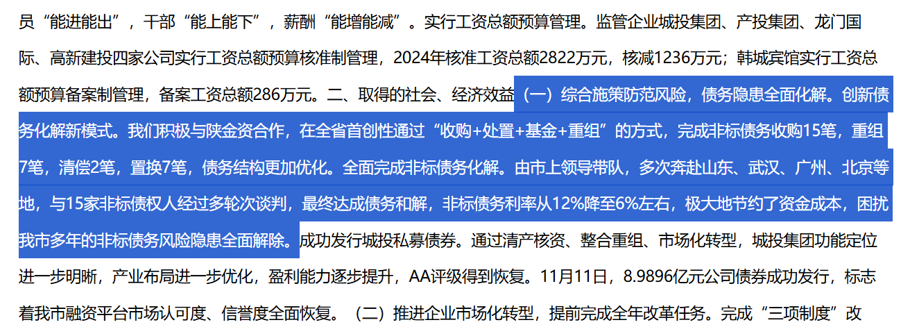 而在化解非標(biāo)債務(wù)的攻堅(jiān)道路上,韓城市上述取得的成果獲得了業(yè)內(nèi)的一致好評(píng)。