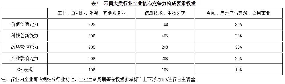 圍繞9個大類行業(yè),各構(gòu)成要素的權(quán)重設置側(cè)重點不同,其中工業(yè)、原材料、消費行業(yè)、其他服務業(yè)強調(diào)各項能力均衡,信息技術(shù)、生物醫(yī)藥突出科技創(chuàng)新能力,房地產(chǎn)與建筑、金融、公用事業(yè)突出戰(zhàn)略管控能力(表4)。
