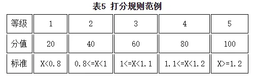 打分規(guī)則。采用比值賦分方式,由企業(yè)自身數(shù)據(jù)與行業(yè)平均、頭部企業(yè)或自身歷史水平的相應比值(例如,企業(yè)自身/行業(yè)平均=X),對應得到不同區(qū)間分數(shù)。其中,正向與負向指標以及部分指標的打分區(qū)間和對應分數(shù)可進行標準化調(diào)整。