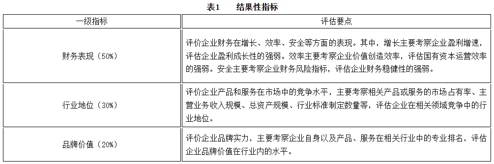 分數(shù)計算。各分項分數(shù)確定后,通過一級、二級指標加權(quán)方式計入總分。其中,結(jié)果性指標最終得分=財務表現(xiàn)*50%+行業(yè)地位*30%+品牌價值*20%。過程性指標最終得分=價值創(chuàng)造能力*權(quán)重+科技創(chuàng)新能力*權(quán)重+戰(zhàn)略管控能力*權(quán)重+產(chǎn)業(yè)影響能力*權(quán)重+ESG表現(xiàn)*權(quán)重。對于業(yè)務較為復雜的企業(yè)集團,集團總體核心競爭力通過對不同子企業(yè)得分加權(quán)確定,其中權(quán)重可參照子公司營收占比,也可依據(jù)戰(zhàn)略規(guī)劃導向由委內(nèi)專家設立。