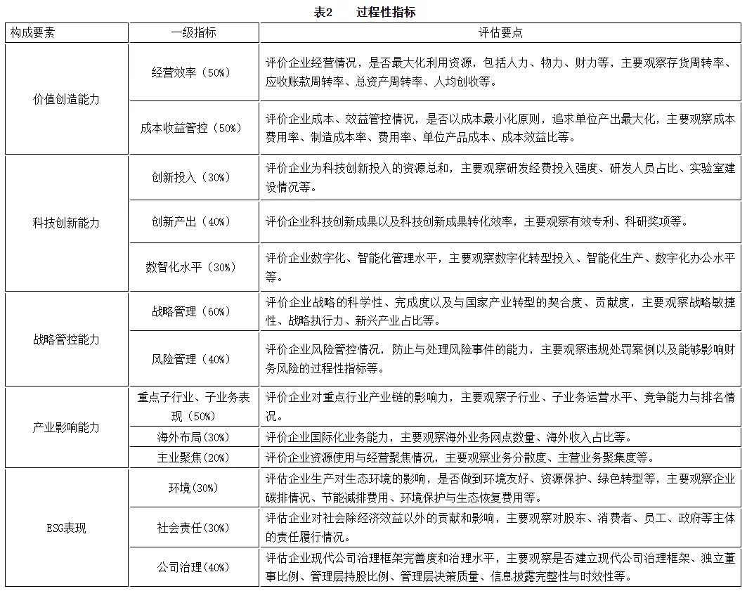 第二個“1”,為一套過程性指標,用以分析企業(yè)核心競爭力強弱的原因,通過觀察核心競爭力的構(gòu)成,捕捉關鍵要素變化,為企業(yè)明確長短板以及重點能力培育方向。具體劃分為價值創(chuàng)造能力、科技創(chuàng)新能力、戰(zhàn)略管控能力、產(chǎn)業(yè)影響能力、ESG表現(xiàn)5個要素,共13個一級指標(表2),指標內(nèi)容及權(quán)重固定。其中,價值創(chuàng)造能力重點體現(xiàn)企業(yè)在競爭中能夠?qū)崿F(xiàn)更高的效率或更低的成本;科技創(chuàng)新能力重點體現(xiàn)企業(yè)科技創(chuàng)新投入規(guī)模、創(chuàng)新產(chǎn)出效率以及業(yè)務模式創(chuàng)新。戰(zhàn)略管控能力重點體現(xiàn)企業(yè)戰(zhàn)略規(guī)劃的科學性、敏捷性以及風險管理情況。產(chǎn)業(yè)影響能力重點體現(xiàn)企業(yè)在相關產(chǎn)業(yè)鏈中的優(yōu)勢地位以及海外布局情況。ESG表現(xiàn)重點體現(xiàn)企業(yè)在環(huán)境、治理和社會責任等方面的效能。