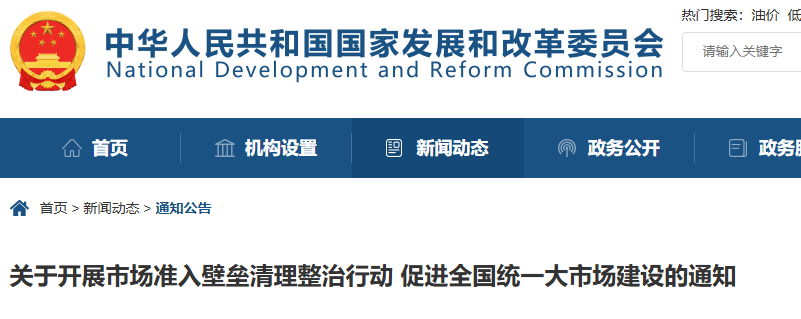 國家發(fā)展改革委 商務(wù)部 市場監(jiān)管總局關(guān)于開展市場準入壁壘清理整治行動 促進全國統(tǒng)一大市場建設(shè)的通知