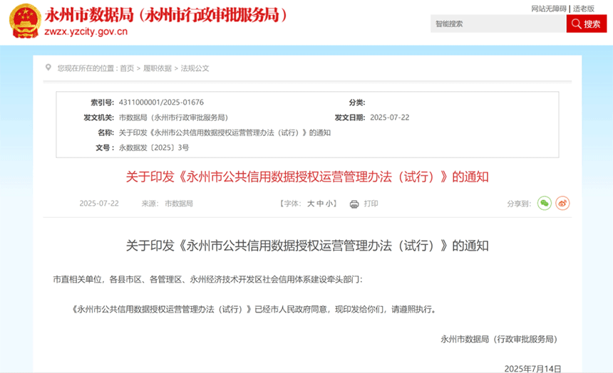 作為全國第四批社會信用體系建設(shè)示范區(qū)及湖南省公共信用數(shù)據(jù)授權(quán)運(yùn)營改革試點(diǎn),永州以制度創(chuàng)新破題,加快公共信用數(shù)據(jù)開發(fā)利用,通過信用數(shù)據(jù)歸集共享模式,打造堅(jiān)實(shí)的信用數(shù)據(jù)“資源池”。永州率先出臺的《永州市公共信用數(shù)據(jù)授權(quán)運(yùn)營管理辦法(試行)》共六章三十七條,聚焦 “安全與發(fā)展并重”,明確遵循 “統(tǒng)籌規(guī)劃、依法合規(guī)、公平公正、合理收益、安全可控”原則,堅(jiān)守 “原始數(shù)據(jù)不出域、數(shù)據(jù)可用不可見”底線,既筑牢數(shù)據(jù)安全防線,又為釋放數(shù)據(jù)價值掃清障礙。這是湖南省首個針對公共信用數(shù)據(jù)授權(quán)運(yùn)營的規(guī)范性文件,標(biāo)志著永州在公共信用數(shù)據(jù)開發(fā)利用領(lǐng)域邁出關(guān)鍵一步。
