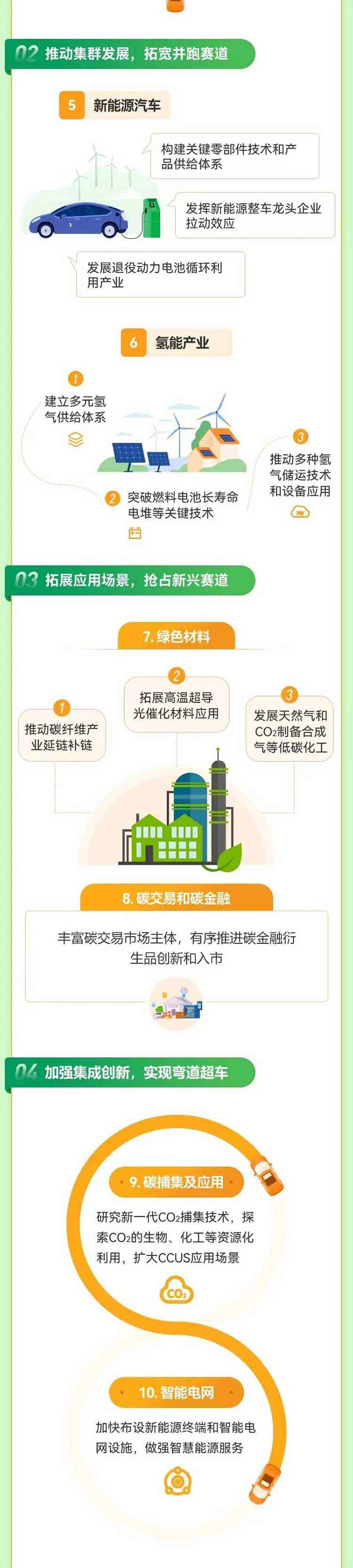 綠色低碳產(chǎn)業(yè)培育行動,將圍繞4個重點方向發(fā)展10個領(lǐng)域。一是聚焦產(chǎn)業(yè)高端,領(lǐng)跑優(yōu)勢賽道。攻關(guān)負碳、新能源和高效儲能等前沿技術(shù);加快重型燃氣輪機、核能、風能等高端裝備關(guān)鍵部件自主攻關(guān);推動重點用能行業(yè)、數(shù)據(jù)中心實現(xiàn)極致能效;攻堅“富氫碳循環(huán)高爐”等低碳冶金先進工藝,做強綠色精品鋼。二是推動集群發(fā)展,拓寬并跑賽道。構(gòu)建新能源汽車關(guān)鍵零部件技術(shù)和產(chǎn)品供給體系,發(fā)展動力電池循環(huán)利用產(chǎn)業(yè)。建立多元氫能產(chǎn)業(yè)供給體系,突破燃料電池長壽命電堆等關(guān)鍵技術(shù)。三是拓展應用場景,搶占新興賽道。加快碳纖維、高溫超導、光催化材料等綠色材料推廣應用。發(fā)展碳交易和碳金融,鼓勵金融機構(gòu)參與、活躍碳金融市場,有序推進碳金融衍生品的創(chuàng)新和入市。四是加大集成創(chuàng)新,實現(xiàn)彎道超車。提高碳捕集及應用、智能電網(wǎng)等創(chuàng)新應用能級。
