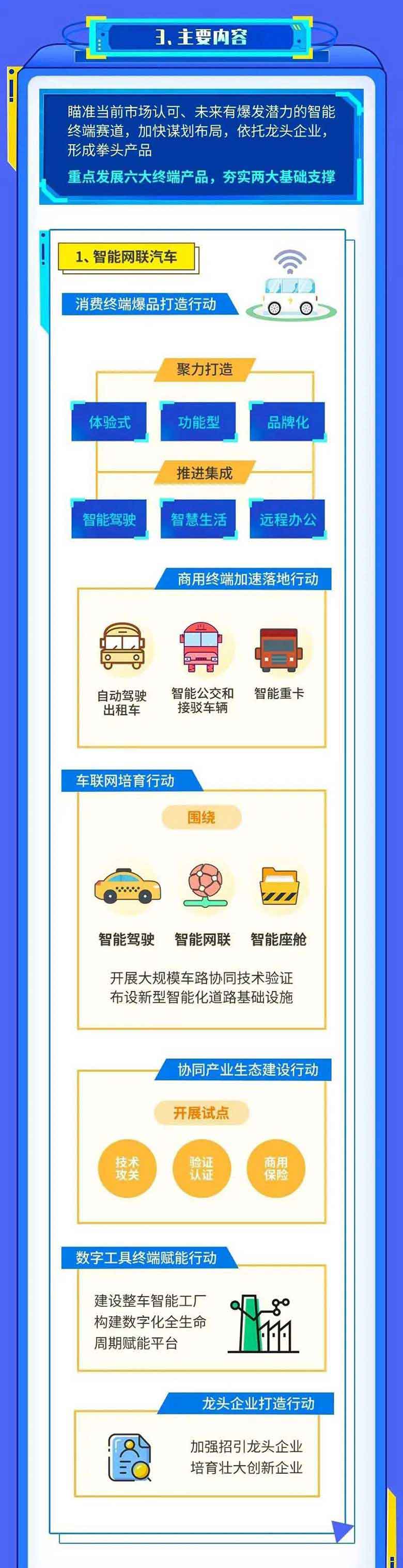 圍繞打造家喻戶曉的終端品牌,構(gòu)建自成體系的終端生態(tài),將大力發(fā)展智能網(wǎng)聯(lián)汽車、智能機器人、虛擬現(xiàn)實交互、智能家居、智能穿戴等智能終端,目標到2025年,產(chǎn)業(yè)規(guī)模突破7000億元,營收千億級企業(yè)不少于2家,百億級企業(yè)不少于5家,十億級企業(yè)不少于20家;打造10款以上爆款智能網(wǎng)聯(lián)汽車,在交通、養(yǎng)老、醫(yī)療等10大應用場景涌現(xiàn)100+智能終端產(chǎn)品。