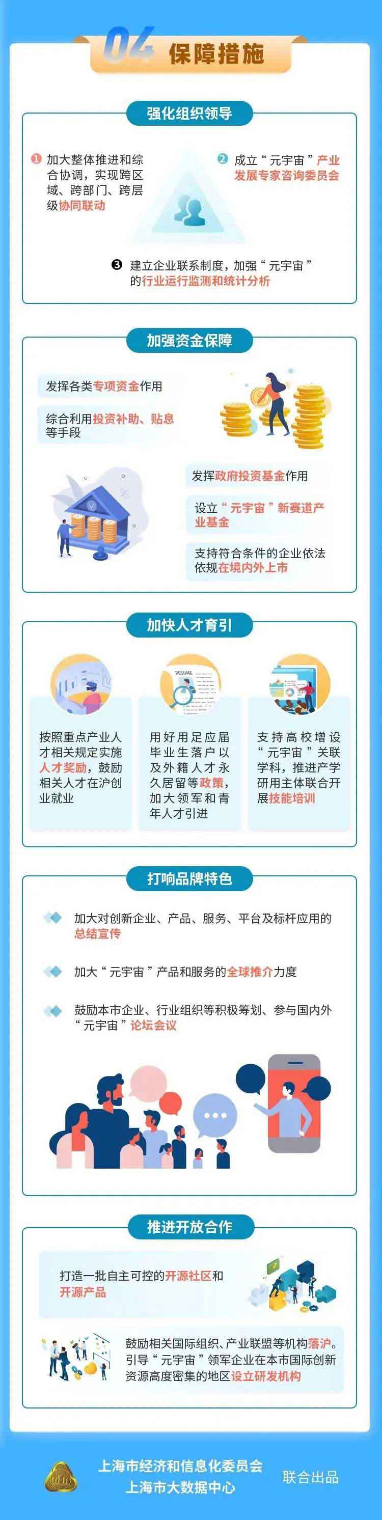 為保障以上新賽道、新產(chǎn)業(yè)高質(zhì)量發(fā)展,將在組織統(tǒng)籌、資金支持、載體布局、人才引育、開放合作等方面提出了一系列政策舉措。如更新發(fā)布2022版產(chǎn)業(yè)地圖,圍繞新產(chǎn)業(yè)新賽道優(yōu)化空間布局,推出一批特色產(chǎn)業(yè)園區(qū);按規(guī)定加大人才獎勵力度,著力培育引進國內(nèi)外復合型人才、創(chuàng)新團隊等;發(fā)起設(shè)立百億級元宇宙產(chǎn)業(yè)基金,支持創(chuàng)新企業(yè)上市;強化國際合作,打造一批具有國際影響力的“上海標準”“上海品牌”,爭取到2025年,綠色低碳、元宇宙、智能終端產(chǎn)業(yè)總規(guī)模突破1.5萬億元。